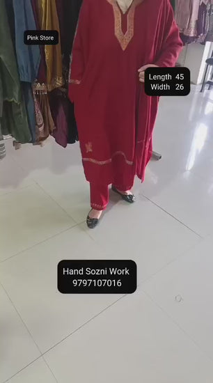 The soft raffel fabric ensures **warmth without heaviness**, making it perfect for winter gatherings and festive occasions. The fine sozni work enhances the beauty of the set with its subtle yet regal detailing, reflecting the timeless artistry of Kashmiri craftsmen.